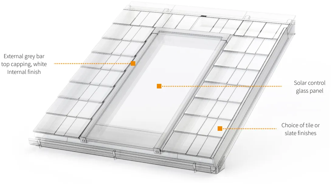 SkyVista’s intelligent design includes self-cleaning glass and effective solar control. This technology reflects 60% of solar heat while allowing 45% natural light, maintaining a pleasant temperature throughout the year. Moreover, the versatility of SkyVista allows for customisation with a range of tile and slate finishes, seamlessly matching your home’s style.